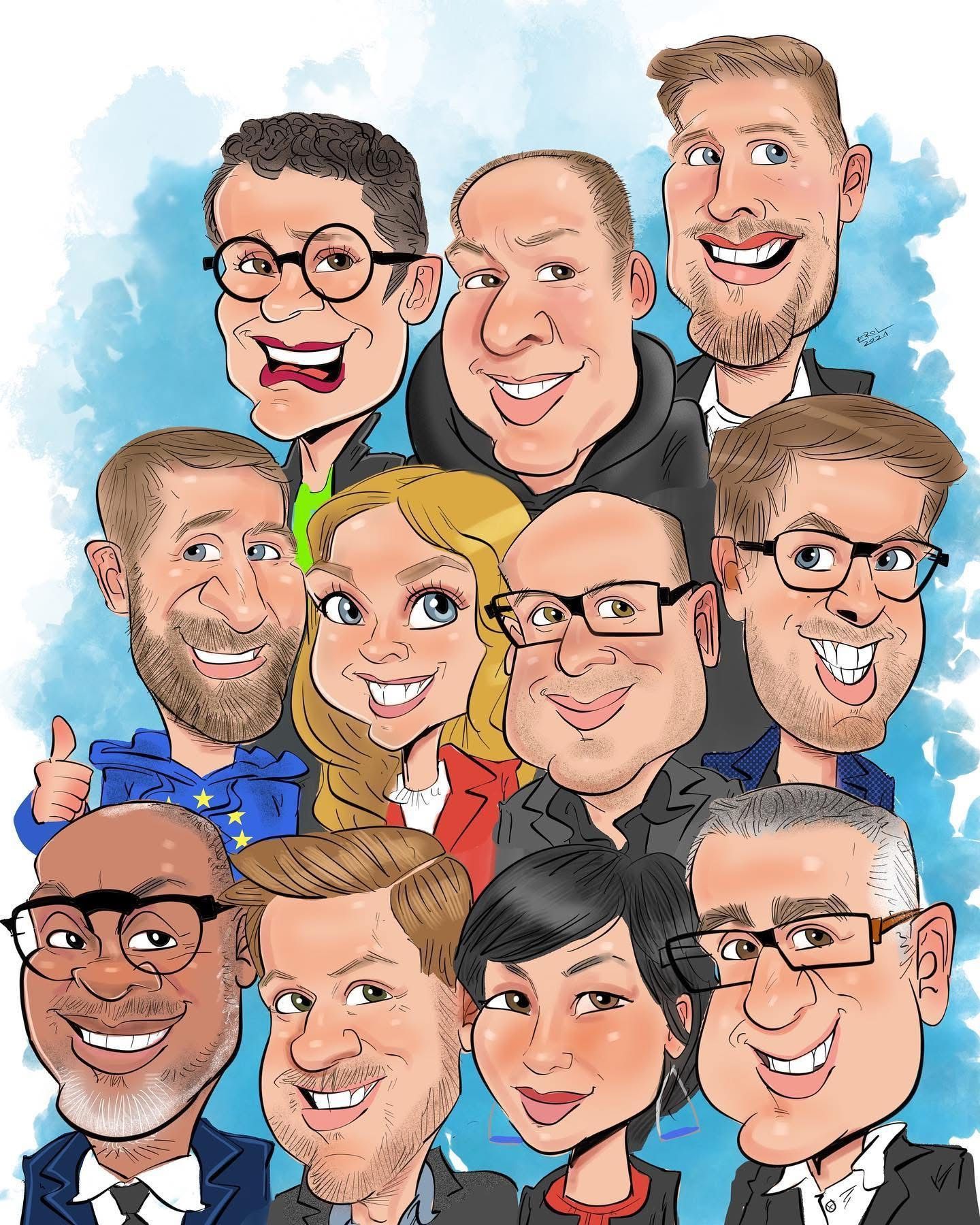 Alle Portrait-Karikaturen zeigen Kopf und Schultern – ähnlich einer Büste – und sind auch als Gruppen- oder Teamkarikatur möglich.